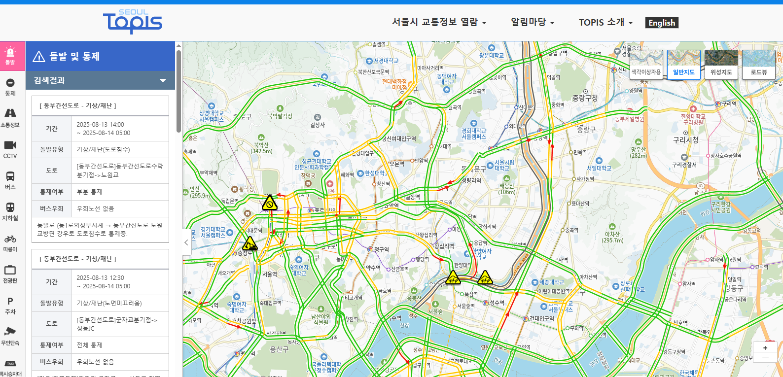 폭우 땐 자가용 vs 대중교통, 뭐가 유리할까?먼저 결론을 말씀드리자면..대체로 대중교통 우위. 폭우 때는 동부간선·강변북로·하천 하부도로가 잇달아 통제되어 장시간 정체가 빈번합니다. 2025‑08‑13에도 동부간선 전 구간과 여러 하부도로가 실제로 막혔죠. 즉, 지하철 중심 노선으로 경로를 짜는 게 안전합니다.단, 예외: 철도도 하천 인접 구간(경의중앙선 등) 은 운행 중단이 발생할 수 있어요. 비가 많이 오는 날 선택 가이드대중교통 추천: 지하철 중심(2·3·5·7·9호선, 신분당선 등) → 환승으로 우회 쉬움, 배차 안정적. (지상 철도는 고지대 우회 노선로 대체)자가용을 꼭 써야 한다면: 출발 전·중 TOPIS ‘돌발/통제’ 지도 상시 확인, 하천 하부도로·잠수교·저지대 지하차도는 즉시 회피.서울..