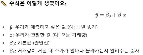 • → 거래량과 주가가 선형 관계라는 걸 모델이 배운 거예요!