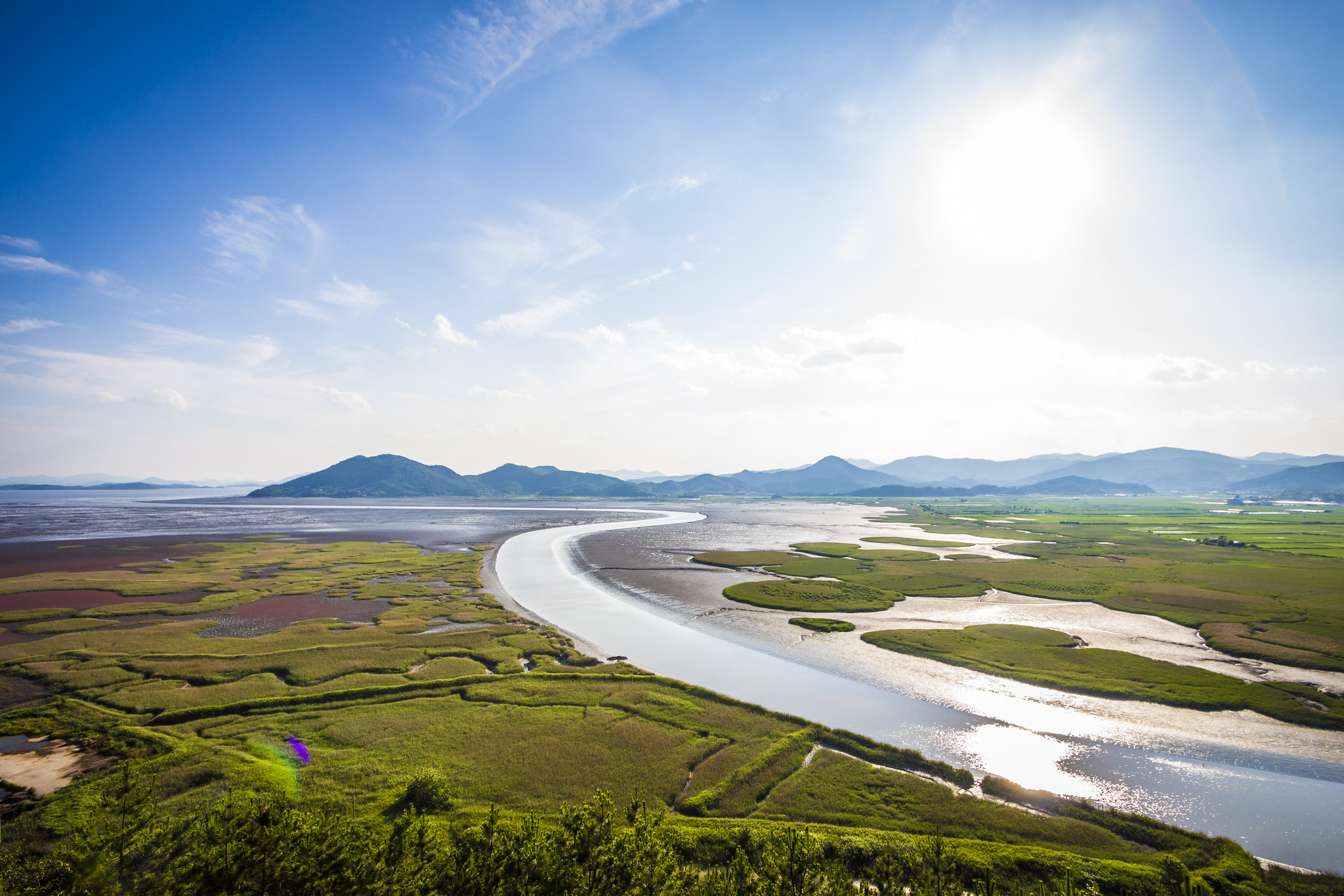 순천만 갯벌은 하루 두 번 바닷물에 잠기고,
