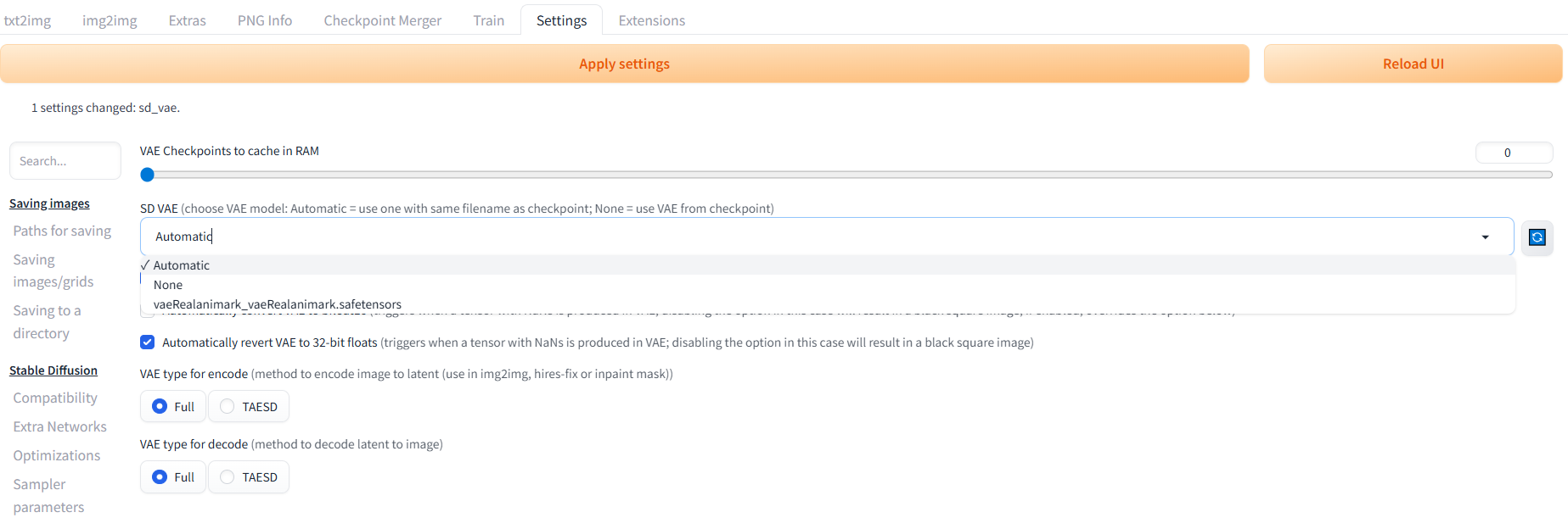 • Settings 탭에서 Stable Diffusion 항목의 VAE 클릭하면 위와 같은 화면이 나옴