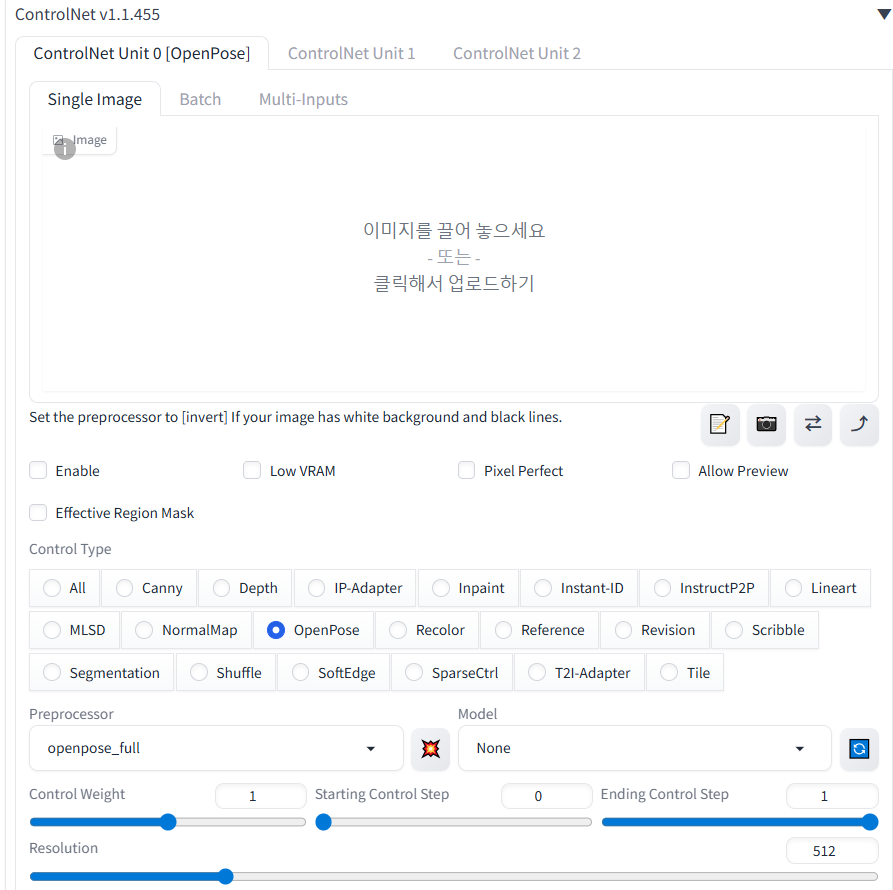 5. txt2img 탭으로 다시 돌아가면 하단에 ControlNet 탭이 생긴것을 확인 할 수 있으며 클릭시 화면과 같이 ControlNet이 활성화 된 것을 확인할 수 있습니다.