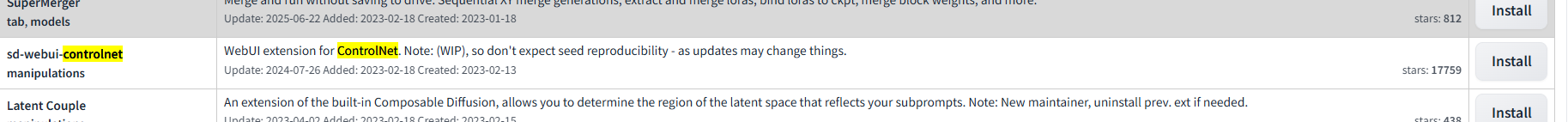 3. Ctrl + F를 눌러 controlnet을 입력하고 sd-webui-controlnet manipulations를 install 해줍니다.