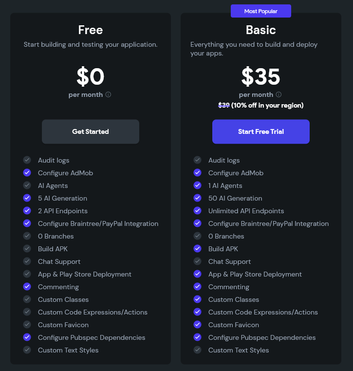 | Basic | $39 (연단위 $29.25) | 프로젝트 무제한, 코드 & APK 다운로드, 커스텀 도메인 웹 퍼블리싱, 로컬 기기 테스트, 앱스토어 원클릭 배포, API 무제한, Swagger Import, 커스텀 코드 표현식, Git CLI, YAML 편집, 기타 고급 개발 툴 사용 가능 |