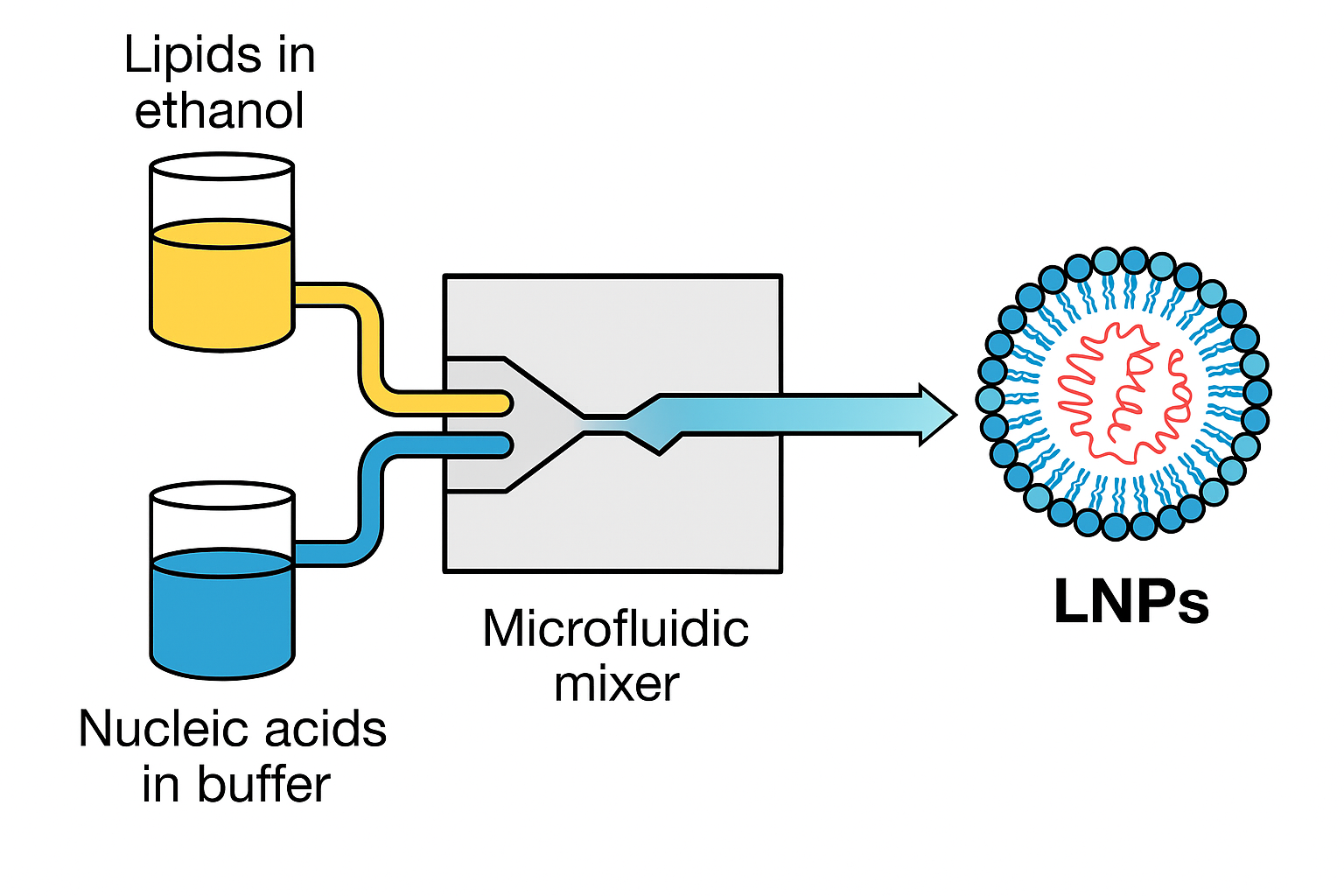 - 혼합 순간 이온화 지질이 양전하를 띠며 핵산과 복합체 형성 → 즉시 나노입자 핵 생성.