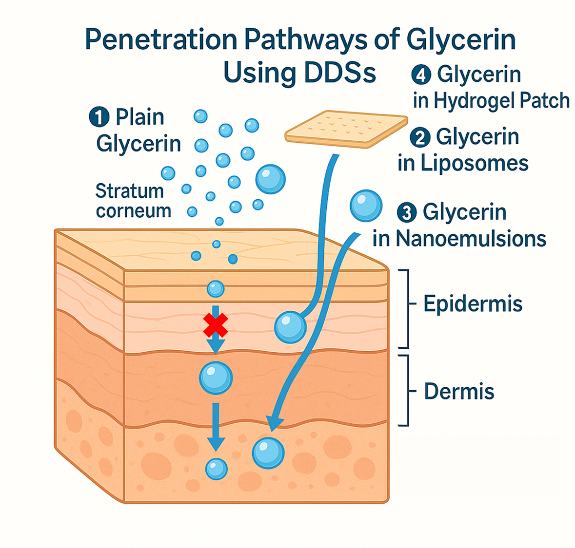 글리세린은 구조가 단순하고 친수성이 강하기 때문에, 단독보다는 지질 기반 DDS와 조합할 때 효과가 훨씬 좋아집니다.