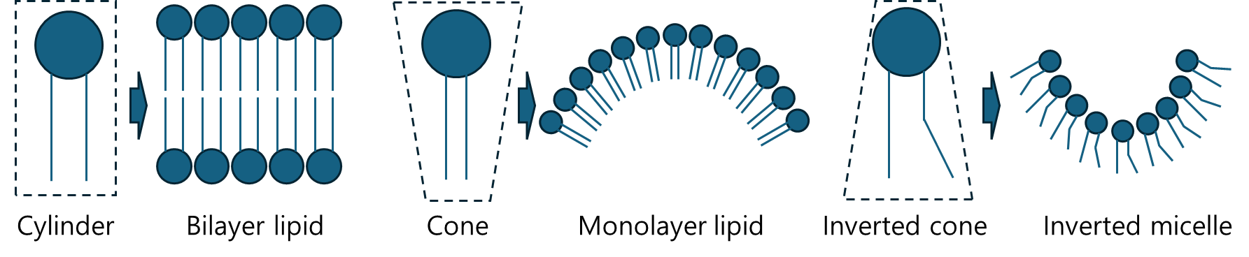 원뿔형(cone-shaped) 지질 조합(DOPE, 특정 스테롤 유도체 등)이 헥사고날상이 증가되어 막을 불안정화합니다. - Hemifusion/nanoleak